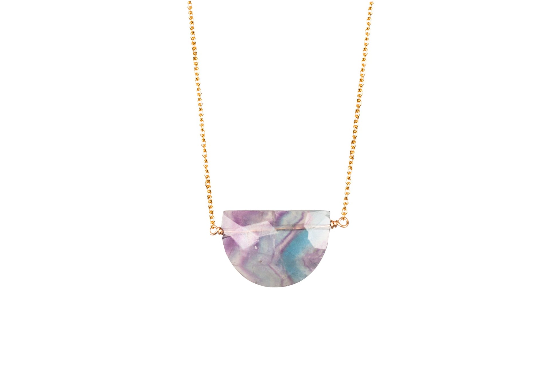 This vibrant fluorite necklace is full of color, light, and personality. Each half-circle fluorite pendant features natural blends of purples, greens, and blues, making every piece completely one of a kind. Hand wire-wrapped in Vancouver, no two pendants are ever the same.