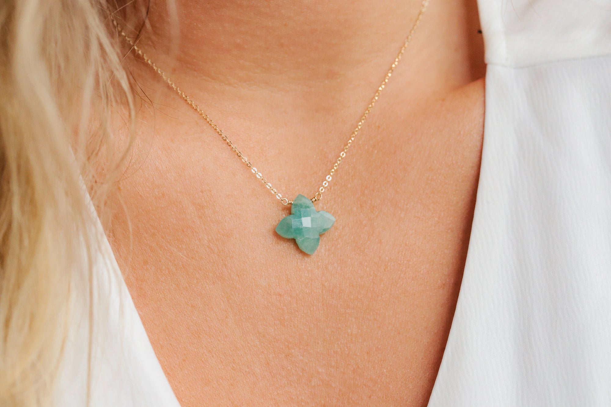 This amazonite necklace features a soft starflower-shaped gemstone, wire wrapped and suspended from a gold filled chain. With its soothing blue-green tones, amazonite brings an effortless, natural beauty, while the starflower shape adds an organic, celestial feel.