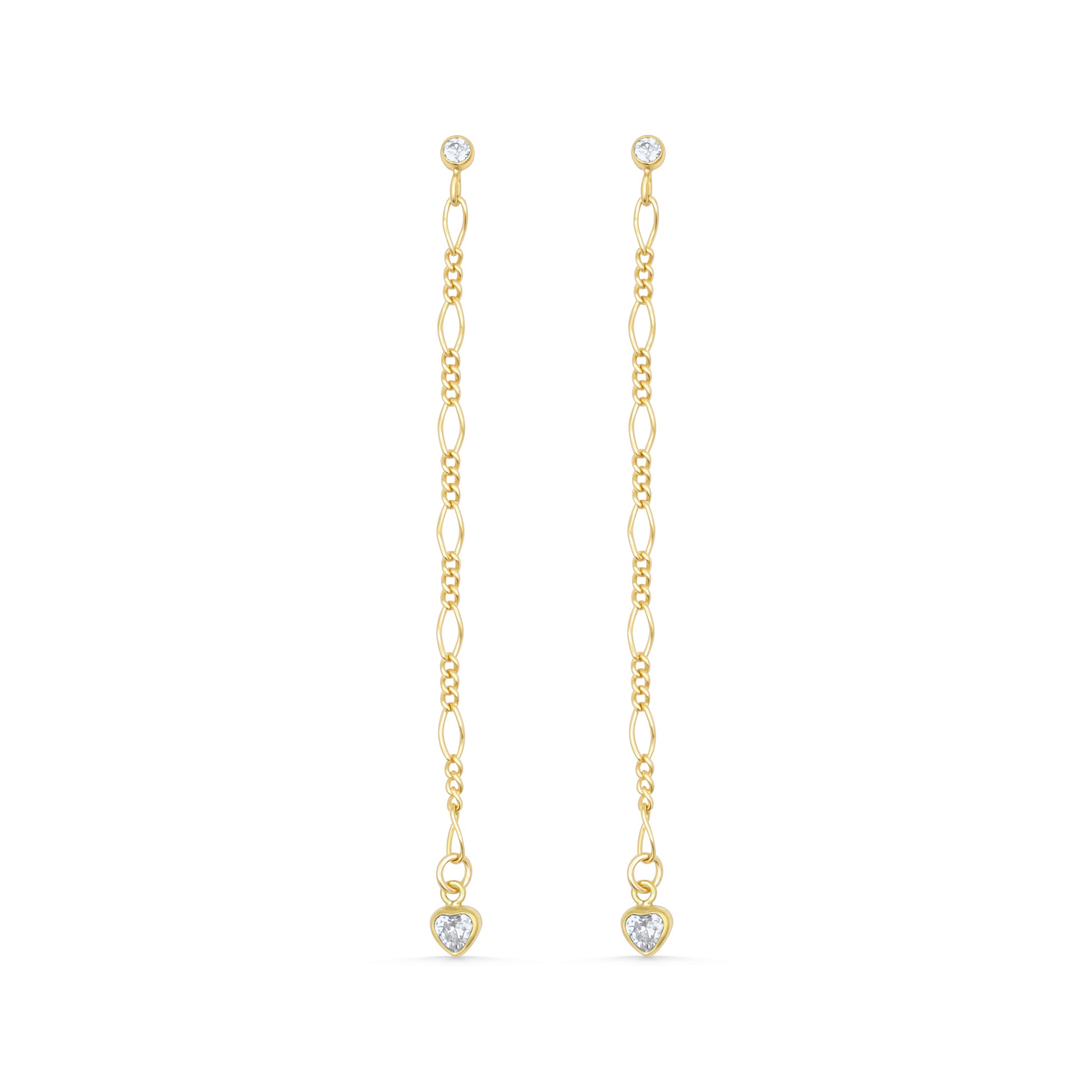 These chic earrings feature 2mm CZ stud tops with a delicate Figaro chain that cascades gracefully, ending in shimmering clear CZ heart drops. Crafted in 14K gold fill, they strike the perfect balance between minimal sparkle and modern movement—perfect for day-to-night wear.