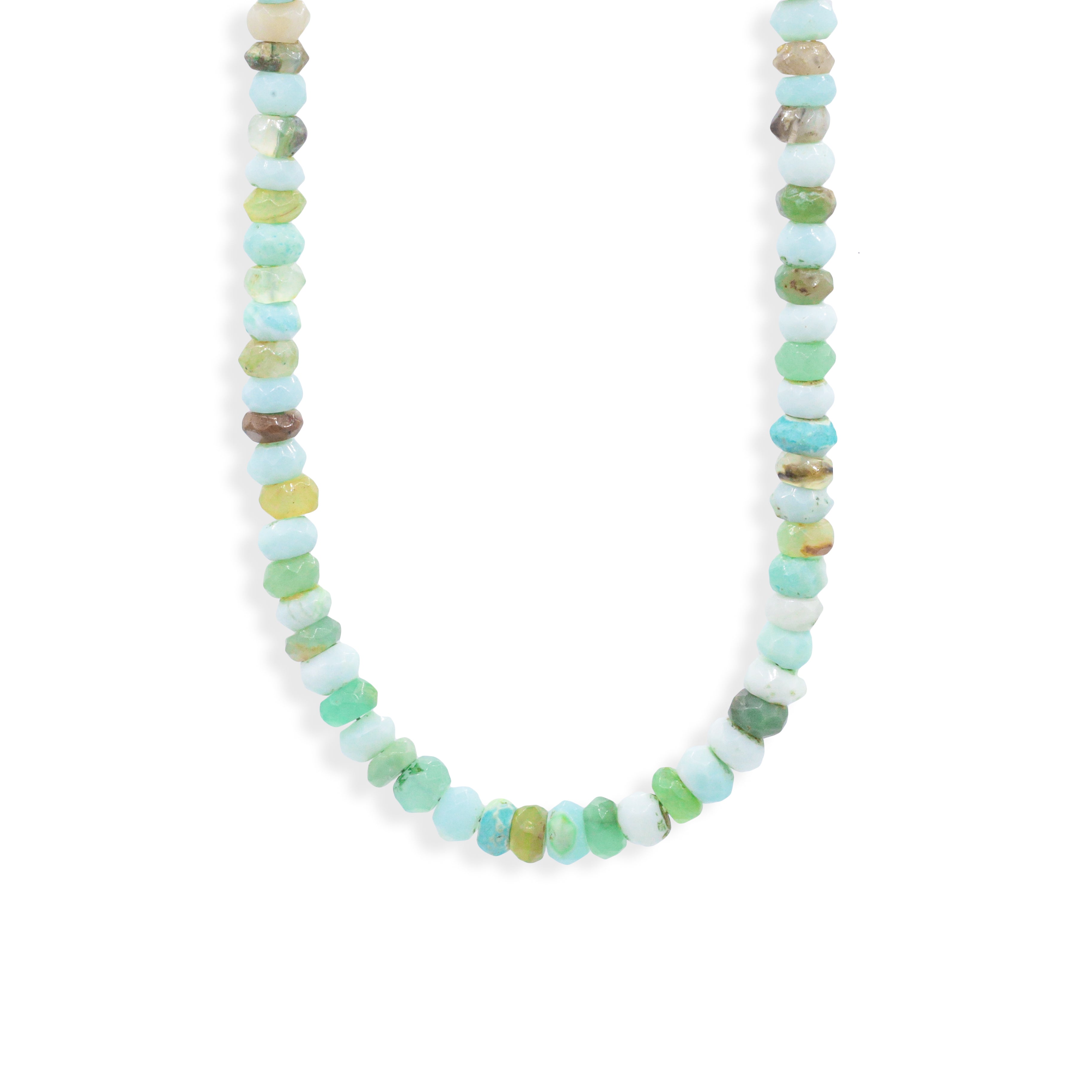 This radiant necklace features genuine Peruvian opal in faceted 4.5mm rondelles, showcasing soothing hues of soft greens and tranquil blues. Finished with a 14K gold filled clasp, each strand reflects the serene, oceanic beauty of this rare gemstone.