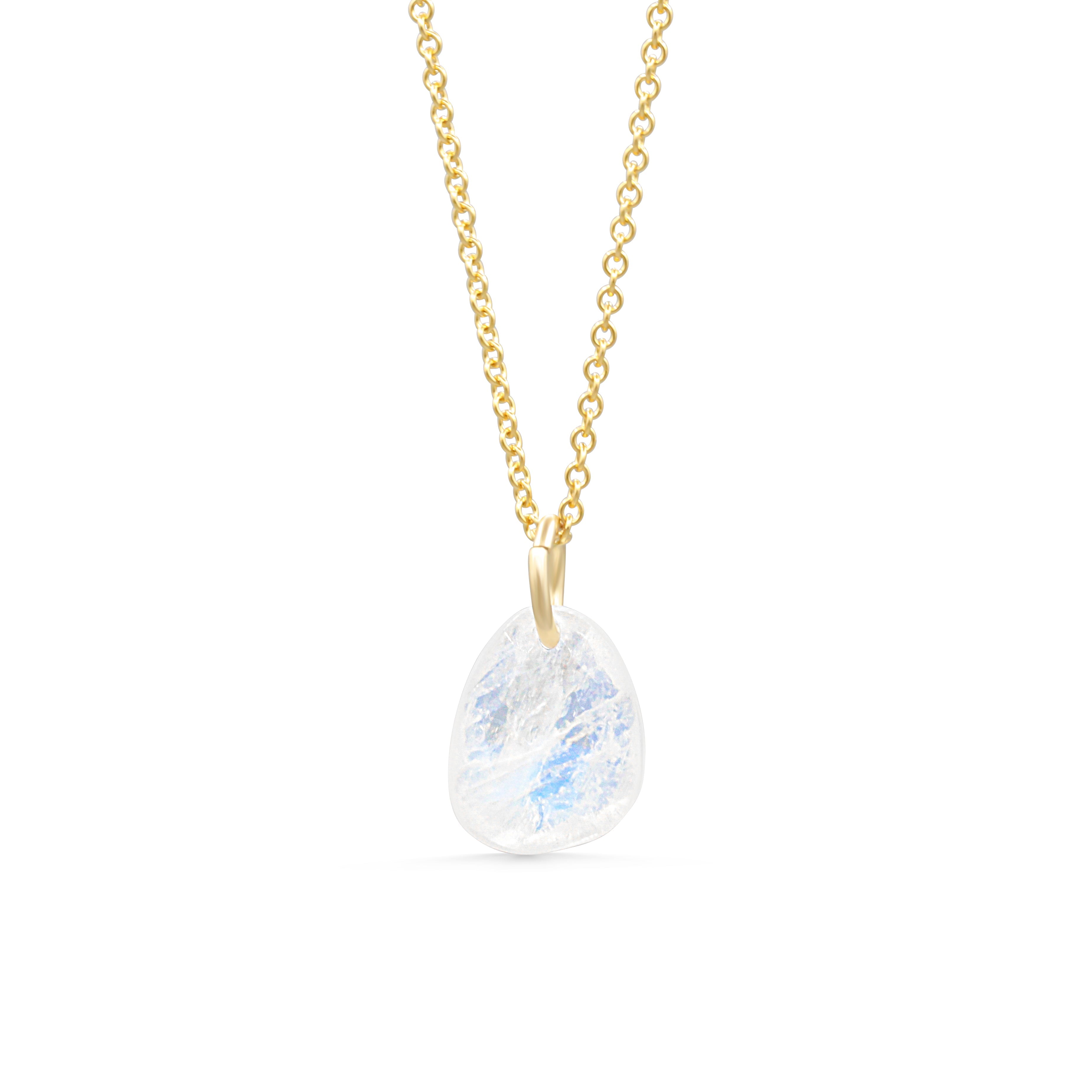 A luminous rainbow moonstone pendant that catches flashes of blue and iridescent light. Set with a 14K gold filled jump ring, it adds a touch of magic and femininity to any chain — an everyday reminder of inner guidance and clarity.