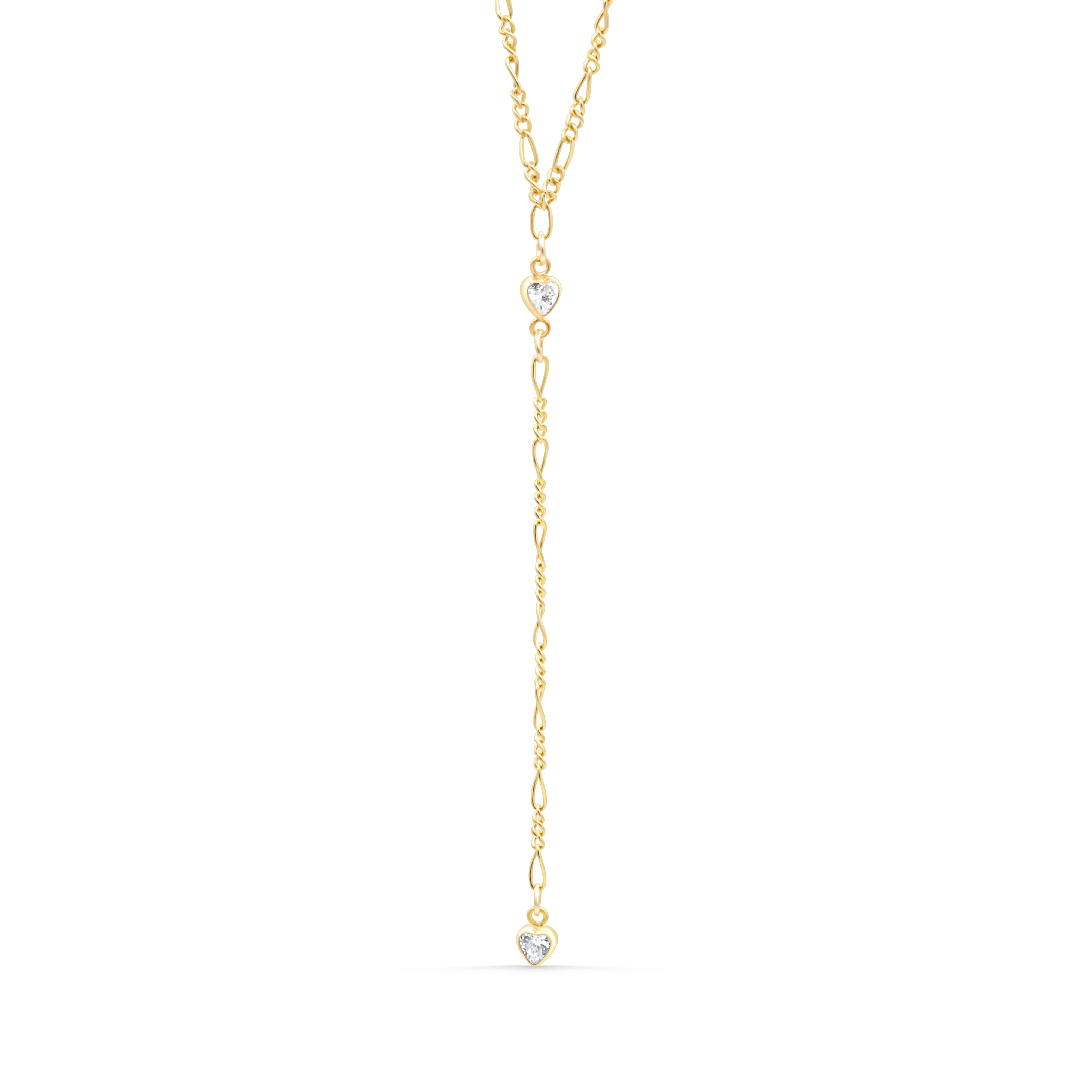This elegant lariat necklace features two sparkling CZ hearts suspended from a fine Figaro chain, creating a graceful drop that catches the light with every movement. Crafted in 14K gold fill, it blends minimal design with just the right amount of shine—perfect for layering or making a delicate statement on its own.